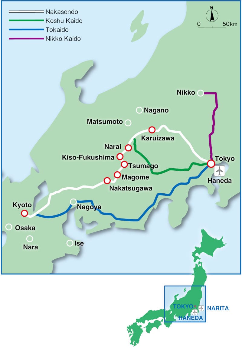 Weaving through the mountains of central Japan, the Nakasendo linked Kyoto and Edo along an inland route of roughly 534 km.