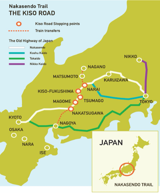 Weaving through the mountains of central Japan, the Nakasendo linked Kyoto and Edo along an inland route of roughly 534 km.